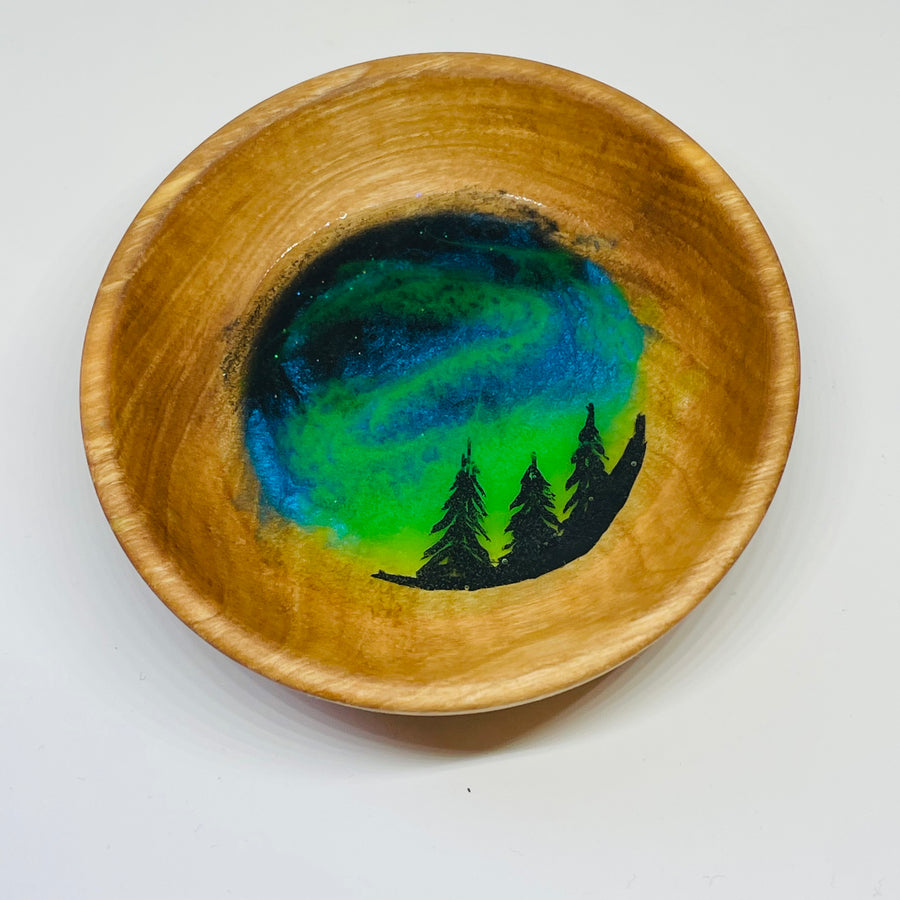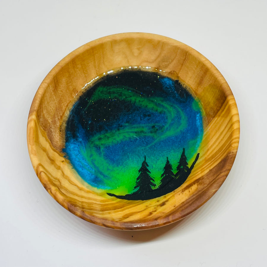 Wood and Resin Small Northern Lights Ring Bowl w/ Trees